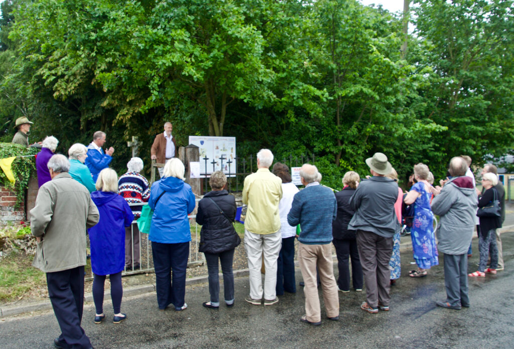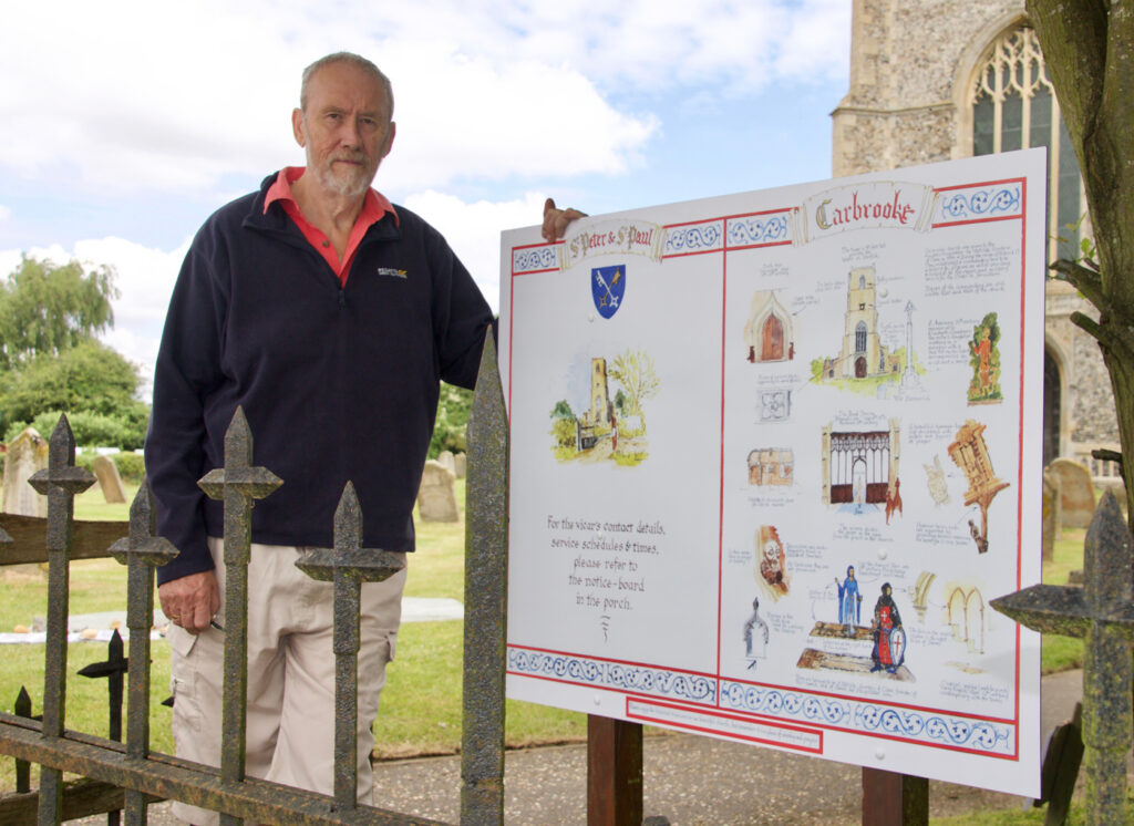 Adrian then began to work on a design for a whole village interpretation board. As he doesn’t live in Carbrooke it was up to the Heritage Group to decide what should be included. Emails, images and ideas passed between Carbrooke and France, until the final design was completed. Again it was sent to Imprint, who mounted three boards, which were installed on August Bank Holiday Monday, 2018, one at the entrance to the Millennium Green, one by the Aerolite footpath on the Norwich Road, and one to be attached to the Community centre on Blenheim Grange when completed.