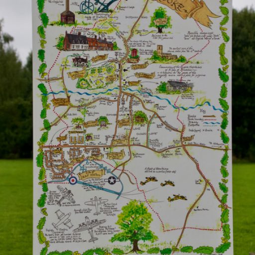 Working out how to produce a user friendly and cost effective board proved difficult, and so it was put on the back burner for several years. Then we had a new member join the group, his father, an artist, had designed a pictorial family tree for their family, the idea seemed suitable to be adapted as an information board for the village.