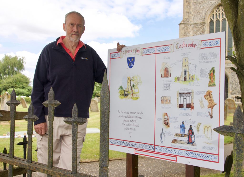 So Adrian Talbot set to work on the art work, he hand painted a beautiful design of the church and its interesting features. Imprint Signmakers of Wymondham printed it onto a special board, laminated and installed it. The Church board was unveiled Friday 30th June 2017, and it is situated by the church gate.
